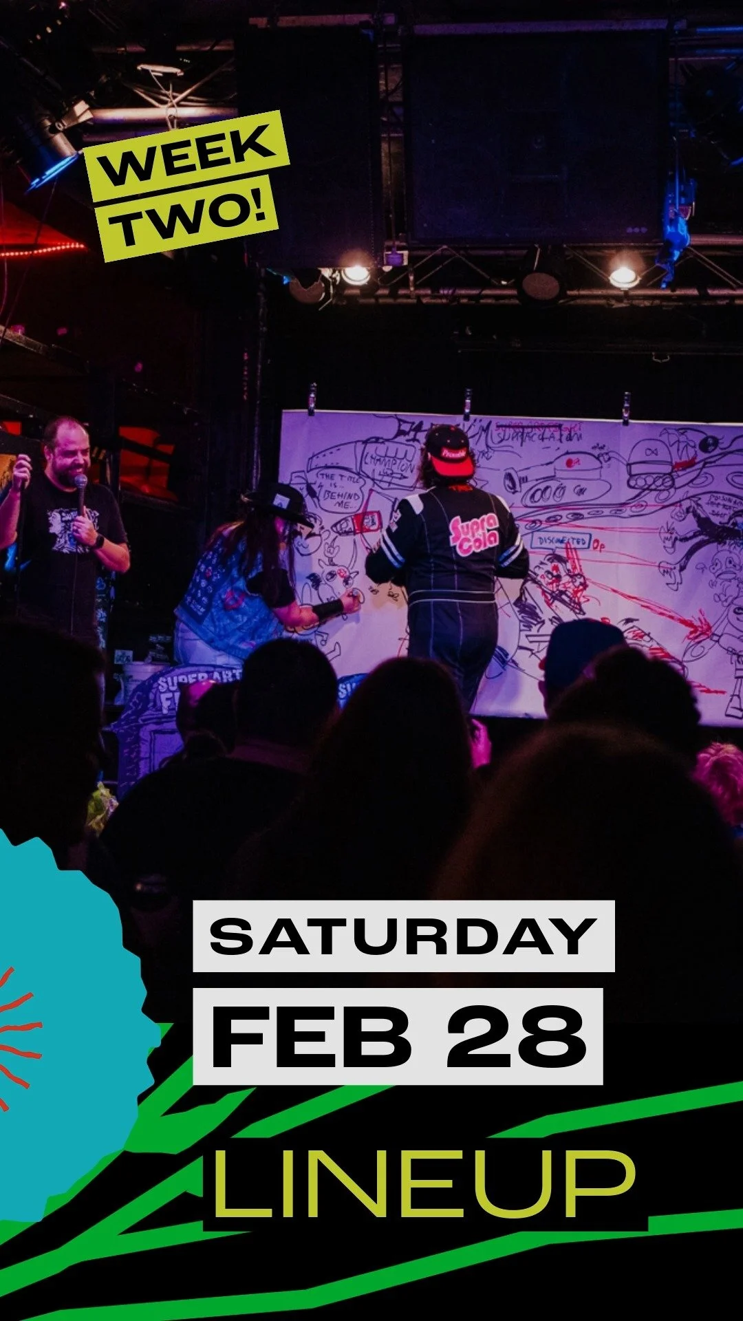 Super Art Fight is a live-action performance where two or more artists battle against each other on a giant canvas. With the help of two quick-witted hosts and the enigmatic Wheel of Death, they compete for the audience’s affection in order to score the win! The winner of a bout is determined by the fans and the fans alone, as we use Science (also known as a decibel reader) to determine how loud the crowd hoots, hollers and cheers to crown the winner. It's cutting-edge, it's creative combat, it's inspired improv, it's the most exciting live art show you’ve ever seen or will see... it's Super Art Fight!